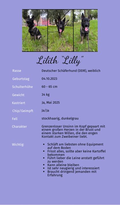 Mein Name ist Lilith und ich bin eine 1A deutsche Schäferhündin, mit Stammbaum und Faxen im Kopf und lebe in Ansbach. Mein Herrchen sagt immer ich gehöre zur DDR Linie, scheinbar ist das irgendwas besonderes.